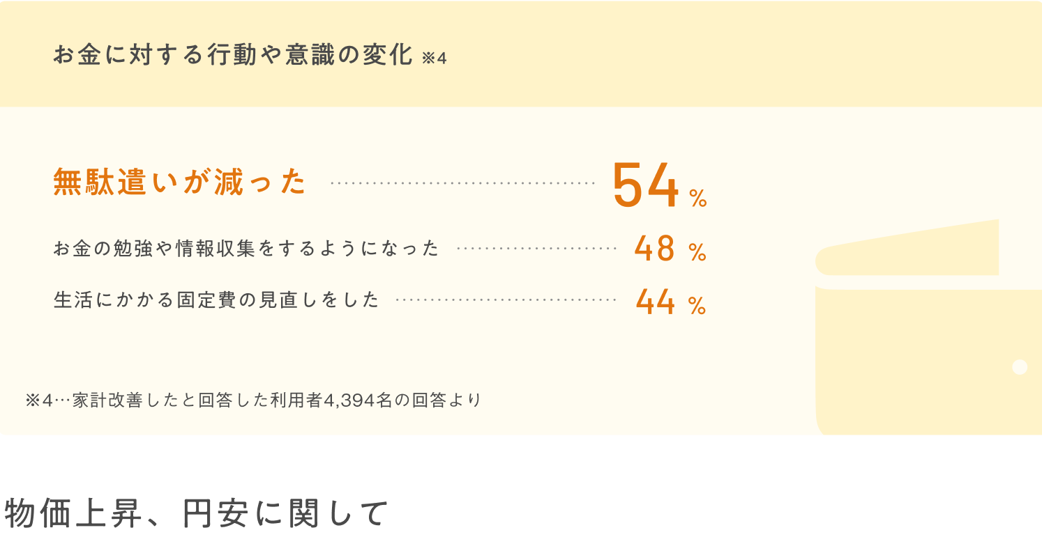 アンケート調査の結果、『マネーフォワード ME』を利用して家計改善を実感した人のうち54%は「無駄遣いが減った」と回答し、平均で月23,426円(年間約28万円)の改善を実感しているなど、物価上昇や円安が続く中でも改善に繋がっていることが分かりました。また、投資に関する意識・興味関心について、全体の55%が2022年を通して「投資に対して意識・興味関心が高まった」と回答しました。