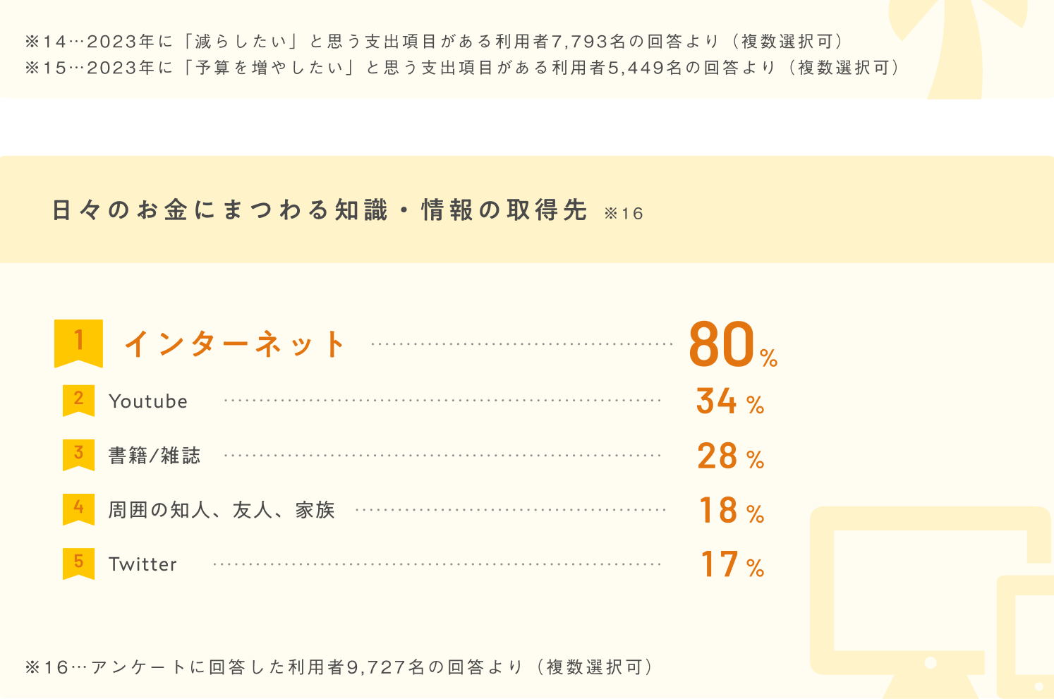 ・日々のお金にまつわる知識・情報の取得先は上位から、「インターネット」「YouTube」「書籍・雑誌」「周囲の知人、友人、家族」「Twitter」。