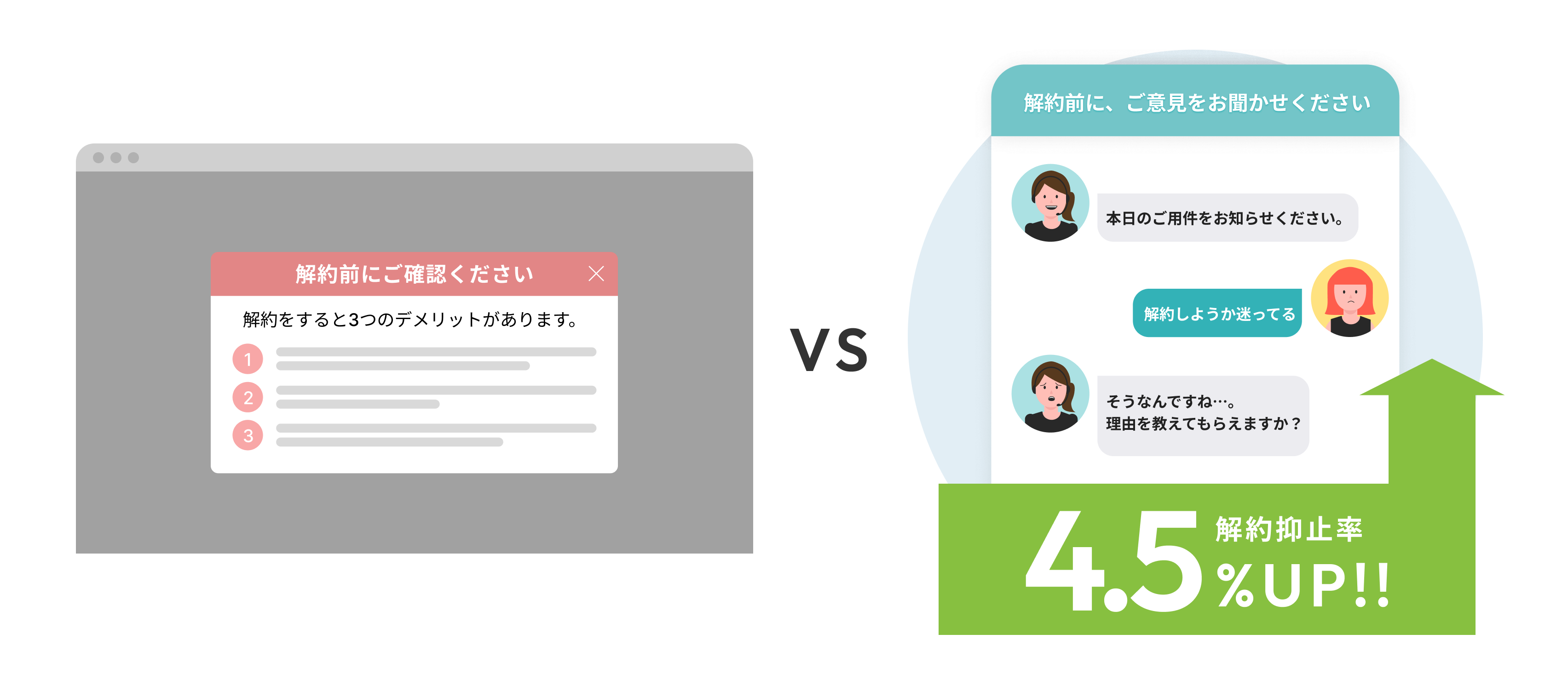 サブスクリプションサービスや、定期通販の既存顧客に対し、「解約」というタッチポイントでコミュニケーションを図り、解約抑止・分析を行います。