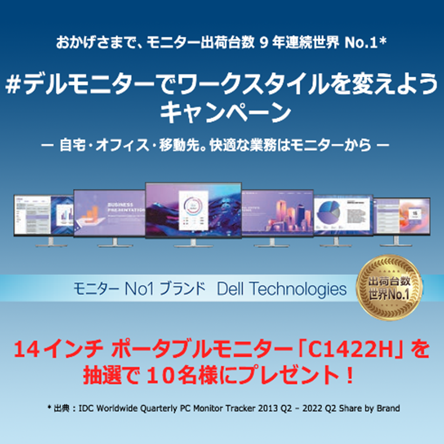 デル・テクノロジーズ株式会社(本社:東京都千代田区、代表取締役社長:大塚 俊彦、以下、デル・テクノロジーズ URL:https://www.dell.com/ja-jp)は、デルのモニター出荷台数9年連続世界No1*を記念するとともに、日頃からデルのモニター製品をご愛用いただいている皆様への感謝を込めて「#デルモニターでワークスタイルを変えようキャンペーン」を12月5日(月)から12月21日(水)まで開催します。キャンペーン期間中、デル・テクノロジーズの公式SNSアカウントから、自宅、オフィス、移動先での業務を快適にするデル モニターの活用方法を発信いたします。