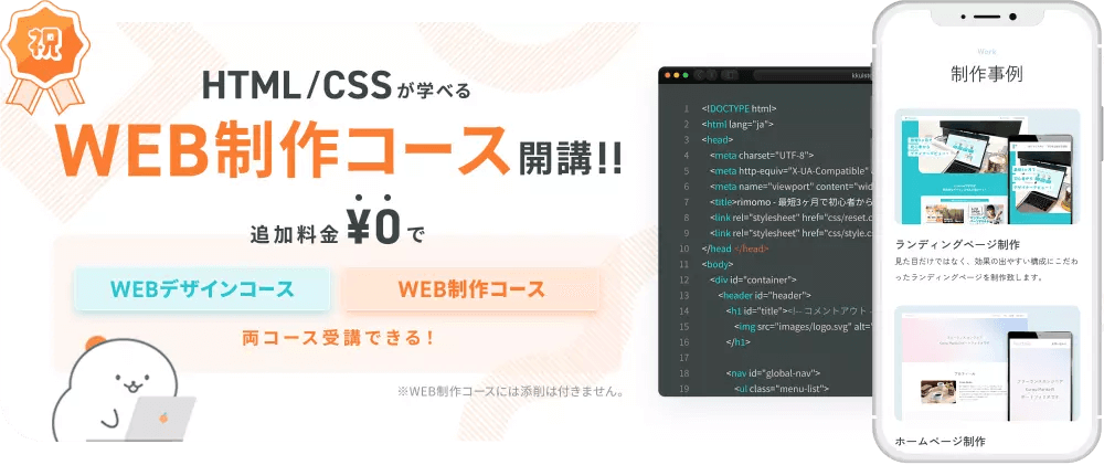 HTML/CSSの基礎知識を学びWEBページ制作の実践方法を学べるコースです。