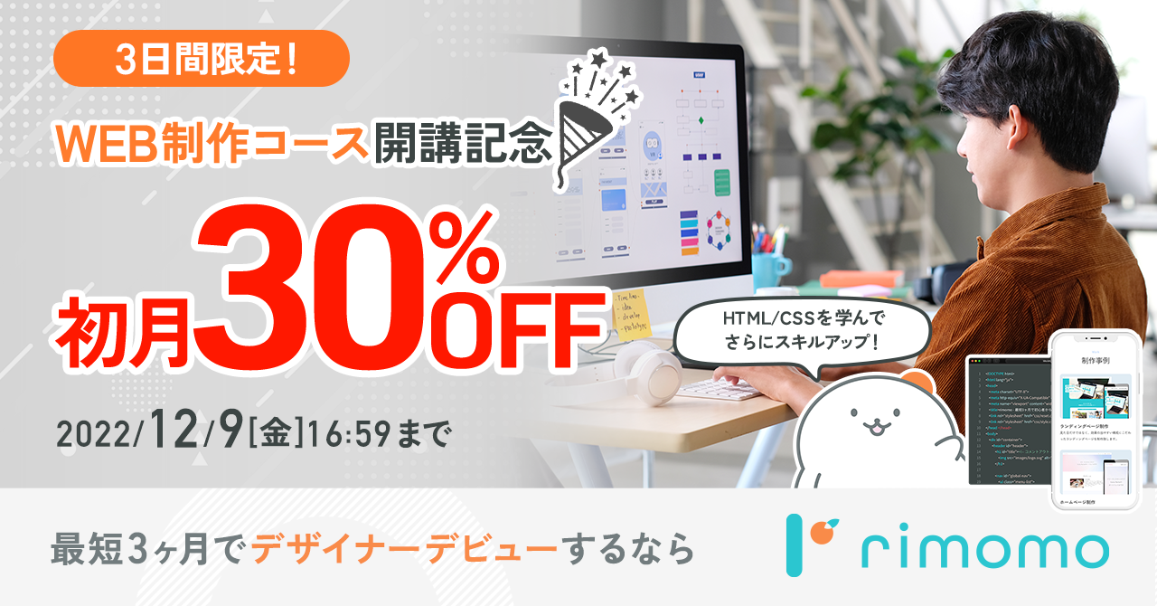 WEB制作コース開講を記念して受講料が初月30%OFFになるキャンペーンを実施中です!