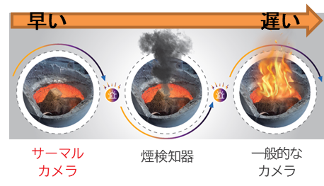 小さな炎を早期に発見し、迅速な初期消火に繋げるためには、少しでも早い段階での発見が重要です。従来の感知器では、災、煙、高温が感知器に到達して初めて警報が出力されますが、これは火災そのものが大きくなり、すでにその区画に広がっていることを意味します。