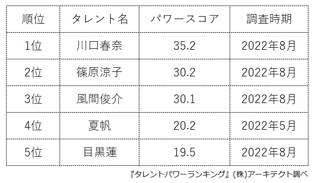 本ランキングは、2022年8月度に実施したタレント調査データ(一部過去実施データ)を利用し、タイトルに応じてランキング形式でまとめたものです。