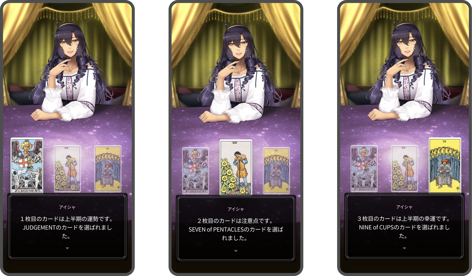 AI占い師の指示に従いシャッフルされたカードを引くと、AI占い師が鑑定結果を丁寧に説明してくれます。