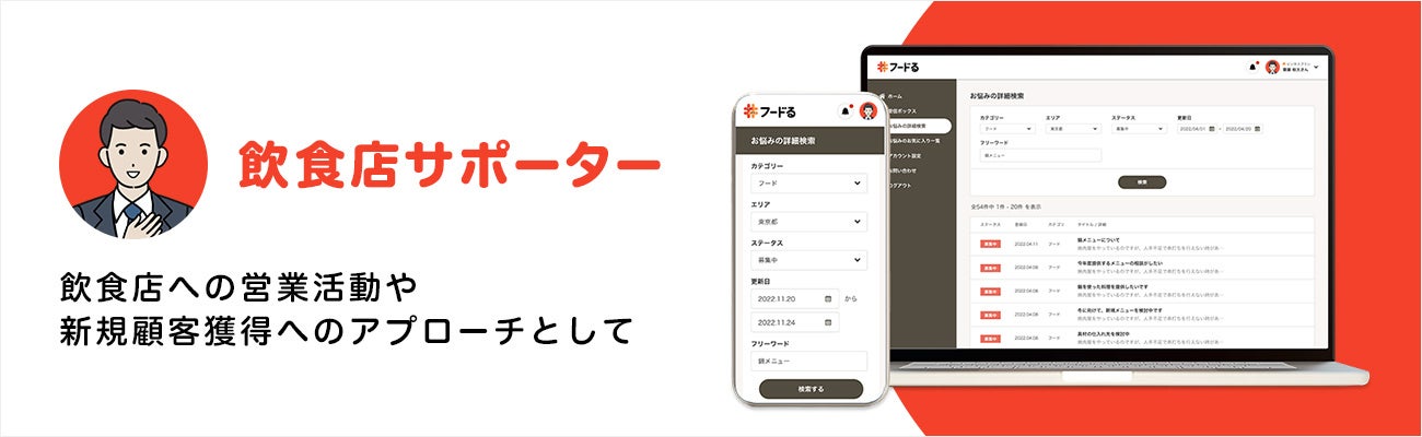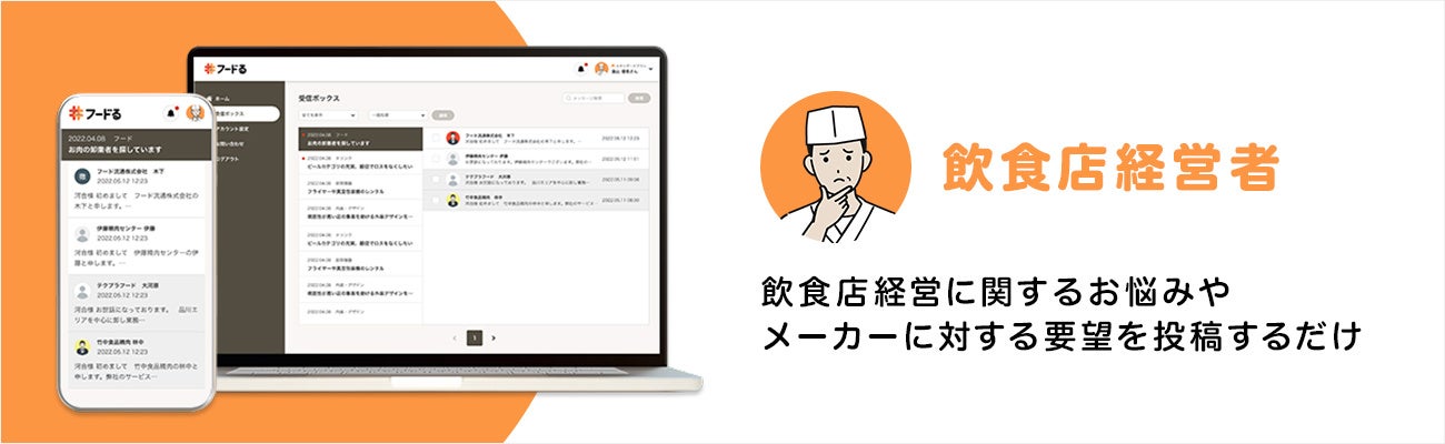 このような背景から、さらなる外食業界の活性化を目指すため、飲食店経営における集客、仕入れ、立地などの様々な悩みを飲食関連メーカーのみならず不動産関連や飲食店のコンサルタントなど、より多くのプロフェッショナルから提案・アドバイスをもらえる仕組みとして「#フードる」を開発いたしました。