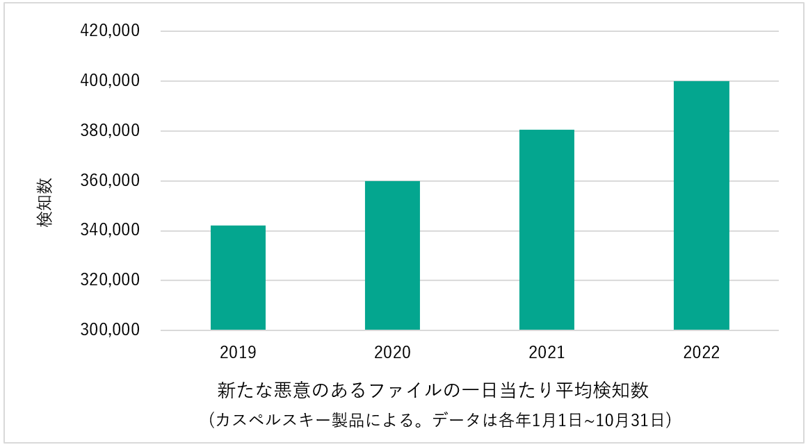2022年1月から10月までの10カ月でカスペルスキー製品が検知した新規の悪意のあるファイルは1日当たり平均40万件に上り、前年同期間比で5%の増加が明らかになりました。また、2021年11月から2022年10月の12カ月間に検知したランサムウェアの1日当たりの検知数は前年同期と比べ2.8倍となりました。