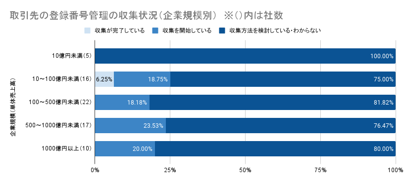 一方、取引先の登録番号の収集が完了したと回答した企業は1.4%と低く、72.9%が取引先情報の収集方法を検討中で、手つかずであることが分かりました。規模別でみると、売上高10億円未満の企業は5社すべてが「検討中」「わからない」と回答。10億円以上の規模でも75〜80%がまだ収集を始めていません。中小だけでなく、多くの従業員を抱える大手も取引先の情報収集があまり進んでいない状況が明確になりました。
