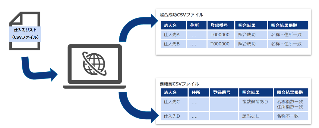 自社の取引先のマスタ情報に対して、国税庁が発行する適格請求書発行事業者の登録番号を簡単に付与できるサービスです。WAPが提供しているオープンソースソフトウェア「Sudachi(スダチ)」の技術により、「(株)鈴木商会」「鈴木商会」でも、正式名の「株式会社鈴木商会」とみなすなど正規化処理を自動で行い、手作業と比べて時間を1/10に短縮できます(当社比)。