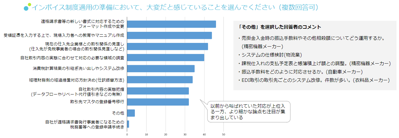 制度適用前の準備段階で「大変だと感じていること(複数回答)」には、適格請求書に合わせたフォーマットの作成・変更、マニュアルづくり、取引関係の見直しなどが上位を占めます。制度開始後も、受け取った領収書や請求書などの証憑を確認する手間や、仕訳の振替、申告作業などを担当する経理/財務部門への負荷を懸念する声や、受領証憑を入力する現場の負担を心配する声が集まりました。