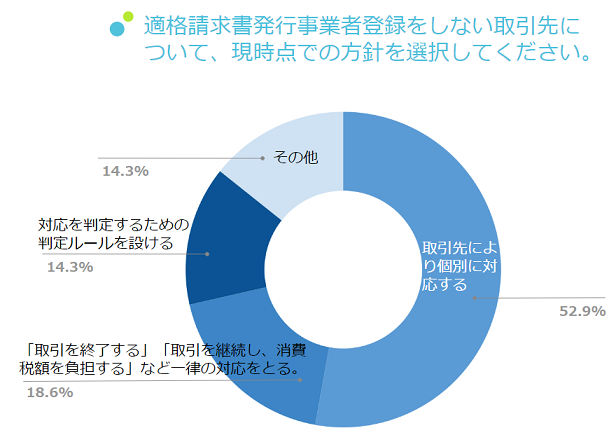 インボイス制度が始まると、適格請求書発行事業者として国税庁に登録した会社などが発行するインボイスがなければ、消費税の仕入税額控除が受けられなくなります。登録しない取引先への対応をたずねると、「個別に検討する」と回答した企業が52.9%ありました。一方、ルールを設けたり、一律での対応を行う企業も30%以上あります。対応の方針を決める際の判断材料としては、「現状の取引金額や規模」「信用調査の信用度や代替取引先の有無」「値下げ状況」などが挙げられました。制度の導入が取引先の見直しにつながる可能性もあり、企業活動にも影響が出そうです。