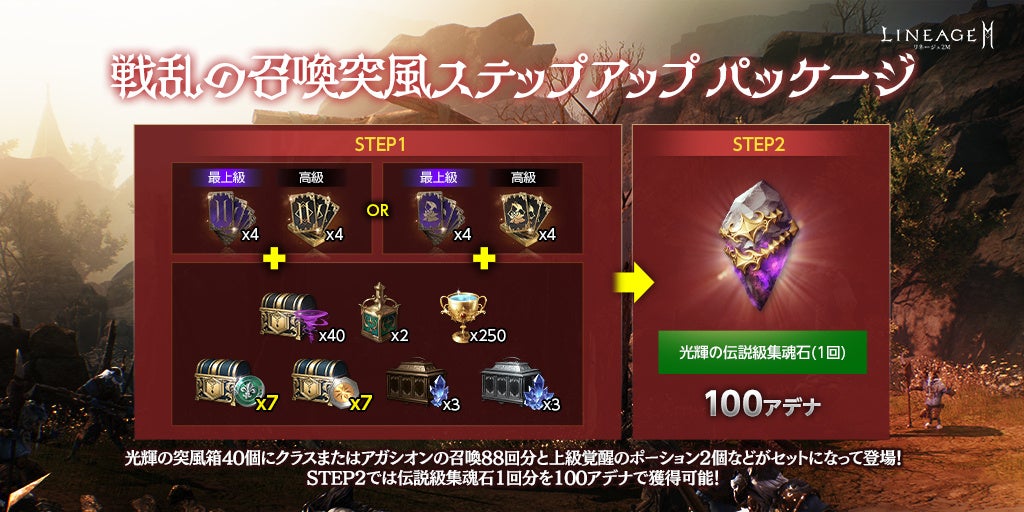「光輝の突風箱(刻印)」40個に、クラスまたはアガシオンの召喚88回分、「上級覚醒のポーション(刻印)」2個、「光る名誉の勲章幸運箱(刻印)」7個、「光る啓示の証幸運箱(刻印)」7個などがセットになった「戦乱の召喚突風ステップアップ パッケージ」が登場しました。