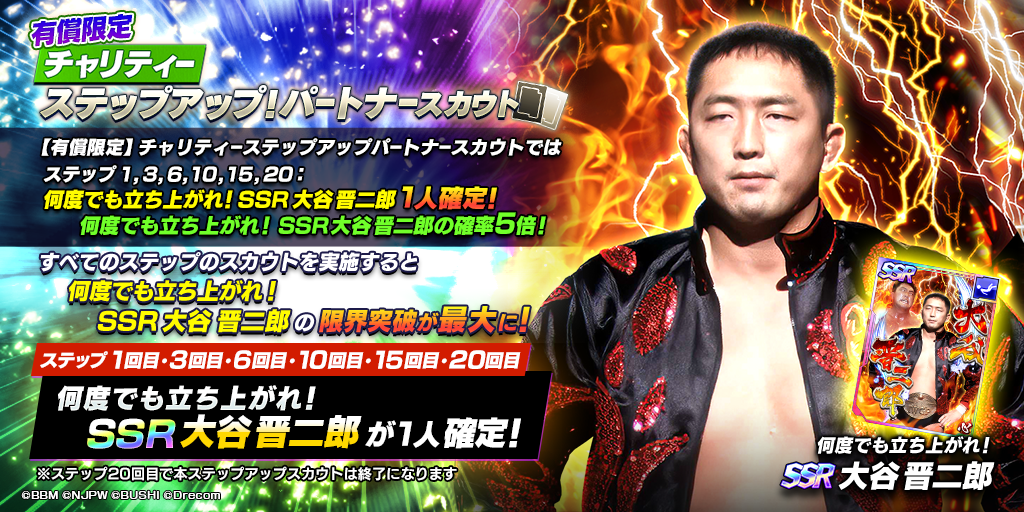 なお、ステップ1回目、3回目、6回目、10回目、15回目、20回目でSSR「[何度でも立ち上がれ!]大谷 晋二郎」が1人確定で獲得することができます。また、本スカウトではステップ数に関係なくピックアップパートナーの獲得確率が5倍となります。