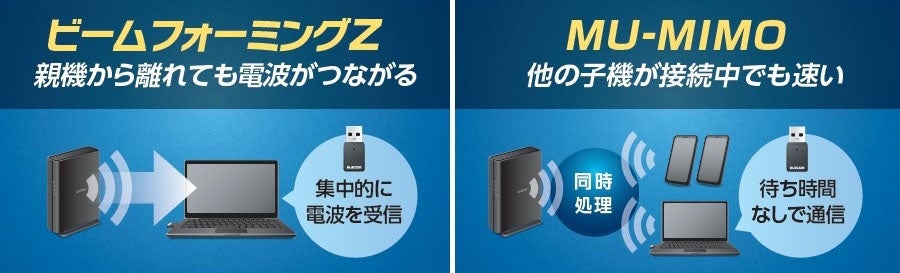 ルーターから離れた場所でも集中した電波を受信できる「ビームフォーミングZ」機能にも対応し、快適に通信が可能です。他の端末と同時にデータを受信・処理することができる「MU-MIMO」機能を搭載しています。ルーター側もそれぞれの機能に対応している必要があります。