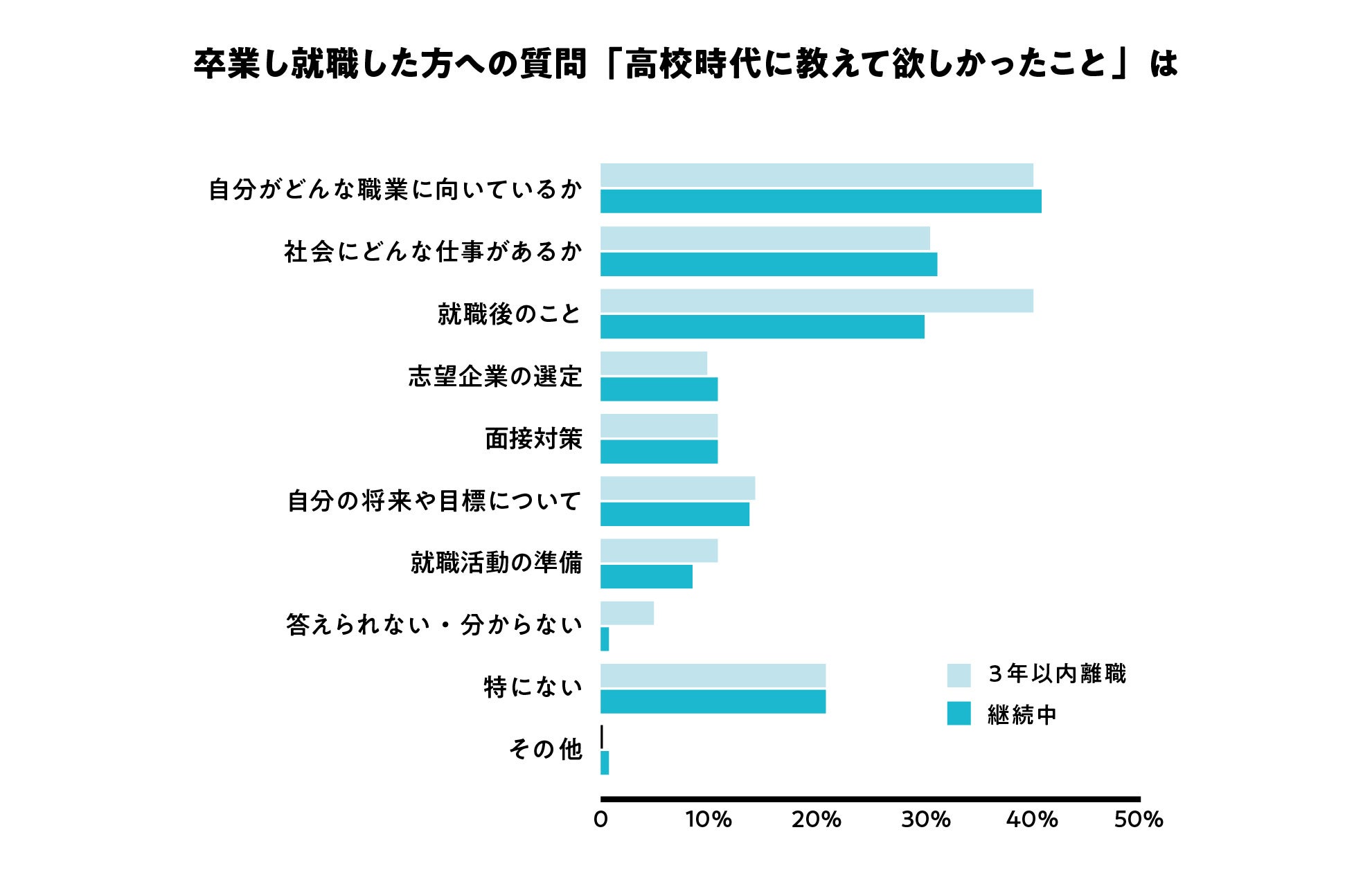 「進路を考える高校生の気持ち」のアンケートでは、進学・就職希望に問わず「不安」という回答が6割を超え、期待や楽しいというよりは不透明な将来に不安を抱える高校生が多いことが分かります。(※1)一方高卒既卒者へのアンケートで「高校の進路指導や就職活動の時に教えて欲しかったこと」を聞いたところ、「自分がどんな職業に向いているか」「社会にどんな仕事があるか」「就職後のこと」が上位回答でした。 1人1人の社会的・職業的自立に向けて必要な能力等を育てるため、早期のキャリア教育が必要と言えます。