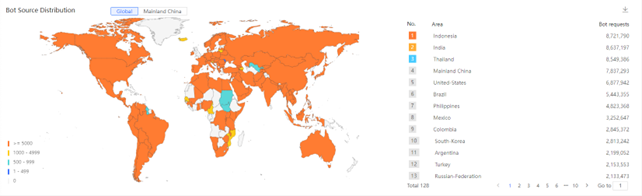 今回の2.2M RPS DDoS攻撃は、128カ国以上にまたがるボットネットから発生していました。攻撃国の上位5位は、1. インドネシア、2. インド、3. タイ、4. 中国本土、5. 米国でした。