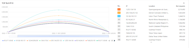 2022年11月8日12時02分33秒(GTM+9)ごろ、170万RPSを超えるDDoS攻撃がCDNetworks Webサイトを標的として始まりました。この激しい攻撃は60秒間続き、最大で220万RPSに達しました。CDNetworksのセキュリティプラットフォームでは、今回の攻撃フィンガープリントと一致する3,400万RPSの大規模攻撃を過去にも確認していました。このため、標的となったCDNetworks Webサイトはボットネット*による今回の攻撃から自動的に・完全に保護され、更なる対策を講じる必要はありませんでした。
