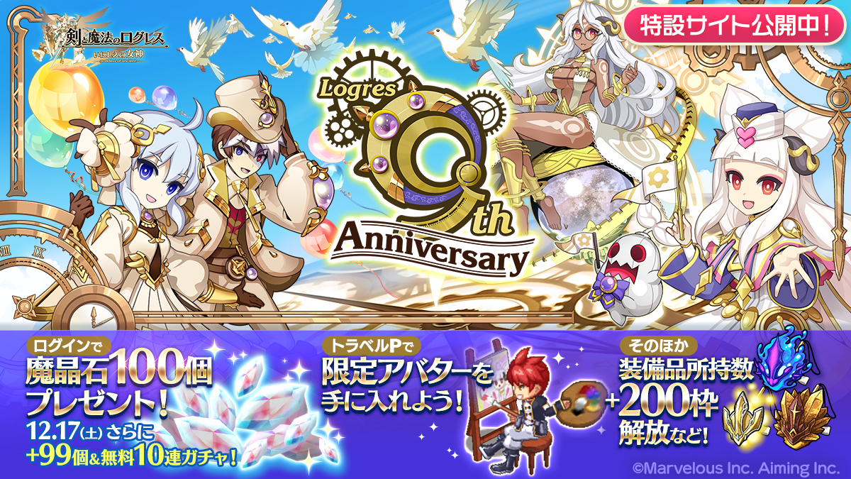 今ログレスを始めるor戻ってくると、魔晶石50個や「9周年記念ガチャチケット」100枚、「アナザーコスモ(MB2)-轟器、妖刀-チケット」などをプレゼント!