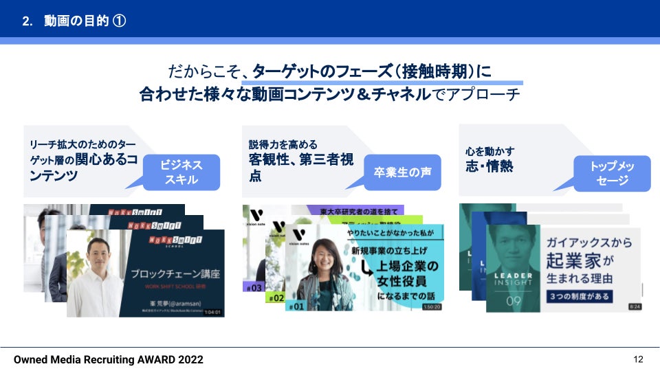 ガイアックスは、新卒入社卒業生の6割が起業するという特徴があり、起業家予備軍層への認知拡大と動機づけで動画を活用しています。
