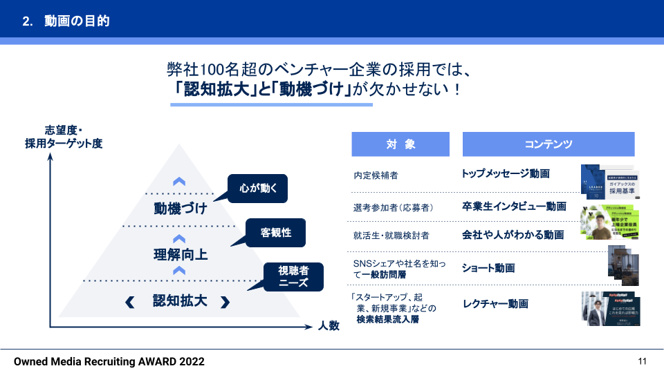 ガイアックスは、新卒入社卒業生の6割が起業するという特徴があり、起業家予備軍層への認知拡大と動機づけで動画を活用しています。