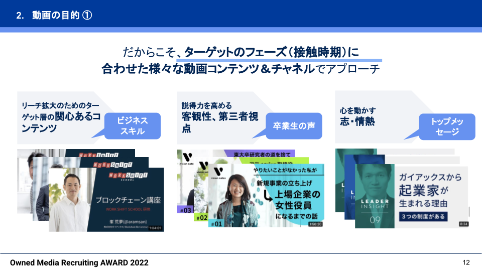 InstagramやYouTubeなど求職者に適したチャネルを利用し、チャネルに合わせた動画コンテンツを展開しています。目的からターゲット分析、そこに向けたメッセージ開発、メディア選定まで緻密に計算し、戦略的な動画コミュニケーションを目指してきました。また、図解や文字を中心とした動画と、社員のリアルな声を紹介するインタビュー動画も作り分け、ガイアックスの機能的価値と情緒的価値の両方を伝える内容、求職者の心を動かす魅力的な訴求を心がけています。