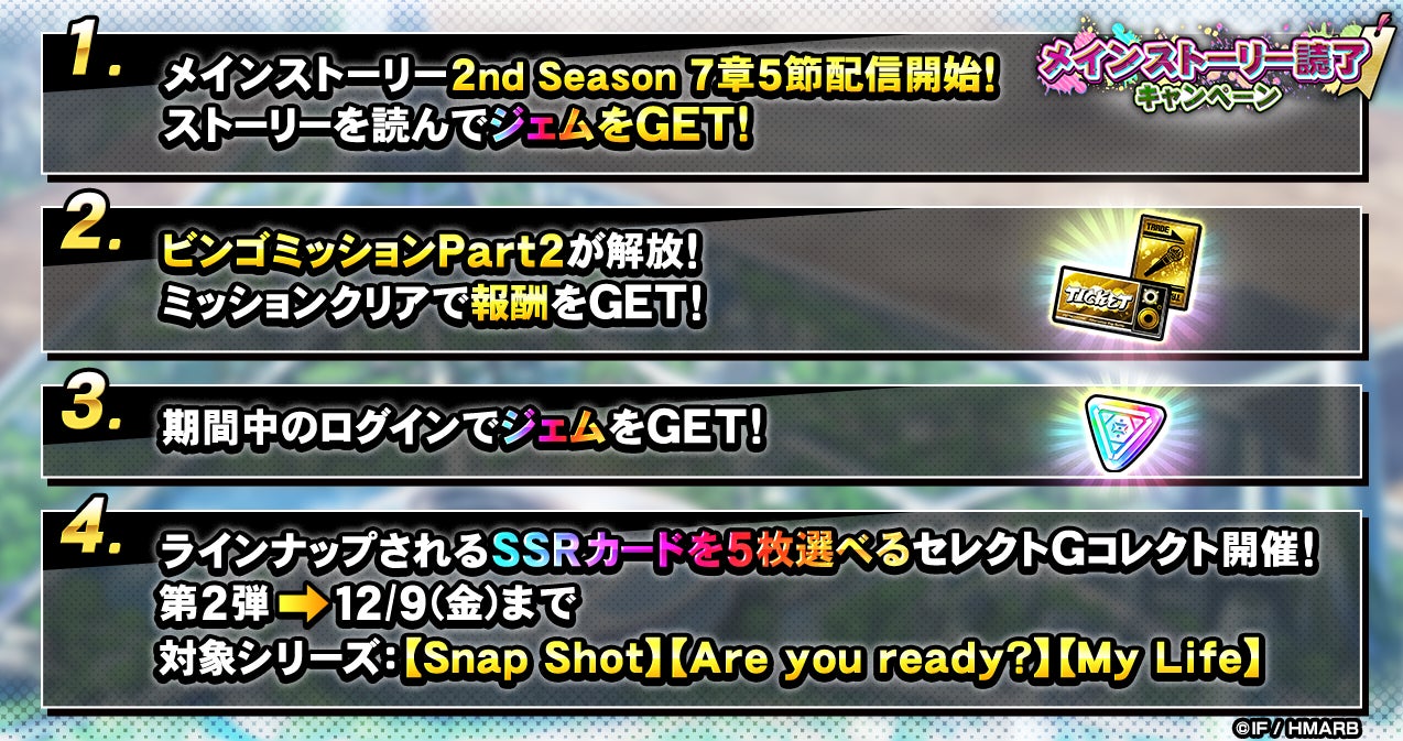 期間中、特定シリーズのSSRカードを選んでラインナップに追加できるセレクトGコレクトや、ビンゴミッションやログインボーナスなどを開催いたします。詳細はアプリ内お知らせをご確認ください。