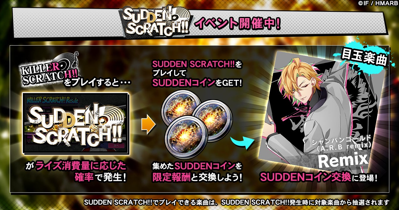 イベント期間中、KILLER SCRATCH!!をプレイするとライズ消費量に応じた確率でSUDDEN SCRATCH!!が発生します。SUDDEN SCRATCH!!をプレイすると、通常の報酬アイテムの他、限定アイテム「SUDDENコイン」を獲得することができます。「SUDDENコイン」を集めることで、新楽曲「シャンパンゴールド(A.R.B remix)」と交換することが可能です。詳細はアプリ内お知らせをご確認ください。