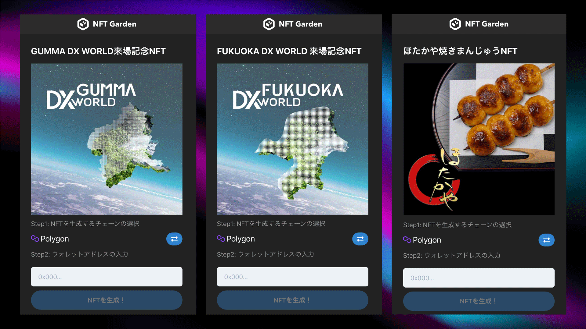 一般社団法人 法人営業デジタル化協会と株式会社musuhiの運営する、群馬×DXをテーマにしたイベント「GUMMA DX WORLD」において、NFT GardenのAPIを使用したイベント限定のNFT配布が行われました。12/1〜12/3の3日間で多くのユーザーがメタバース会場や群馬県庁内のリアルスペースにてNFTの受け取り、NFTの先進性や可能性を体感頂きました。