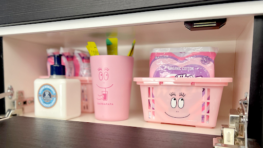 女性トイレの中に専用の棚を設けました。扉を開けると、まるで女子高生のロッカーのように可愛いアイテムを揃えました。