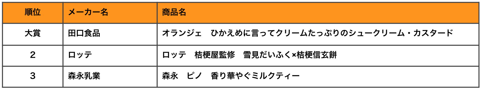 今回総合大賞を受賞したのは、兵庫県に本社を構える田口食品株式会社が展開するブランド「オランジェ」の「ひかえめに言ってクリーム多めのシュークリーム・カスタード」です。やわらかなシュー生地にたっぷりのカスタードクリームが特徴のシュークリームは、「何度もリピートしてる」「持つとずっしり重くて、皮の底が割れてきそうに、クリームたっぷり」などその重量感に感動する声が寄せられています。まさに生活者が支持した商品を表彰する「もぐナビ」ベストフードアワードにふさわしい受賞商品と言えます。また、今年はアイスが総合2位・3位を占める結果となる中で、シュークリームが大賞を獲得している結果となりました。