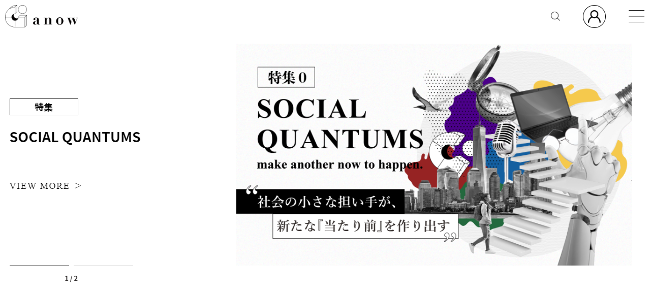 より良い未来を生み出す存在として、私たちが取り上げる人々を「SOCIAL QUANTUM(社会の小さな担い手)」と定義。SOCIAL QUANTUMによる社会の「Another now=新たな当たり前」の創造をアクセラレートすること、そしてSOCIAL QUANTUMとその活動を応援する個、企業、組織が出会い、共創できるコミュニティを形成することをめざします。