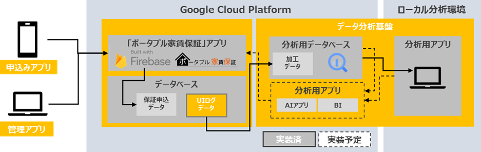 今回インテックは、クラウドサービス上でデータを活用しやすい形で蓄積・集約し、機械学習モデル(AI)を組み込み運用するノウハウを用いて、GCP上に家賃保証サービス「ポータブル家賃保証」およびユーザの行動ログデータを分析する基盤を構築しました。