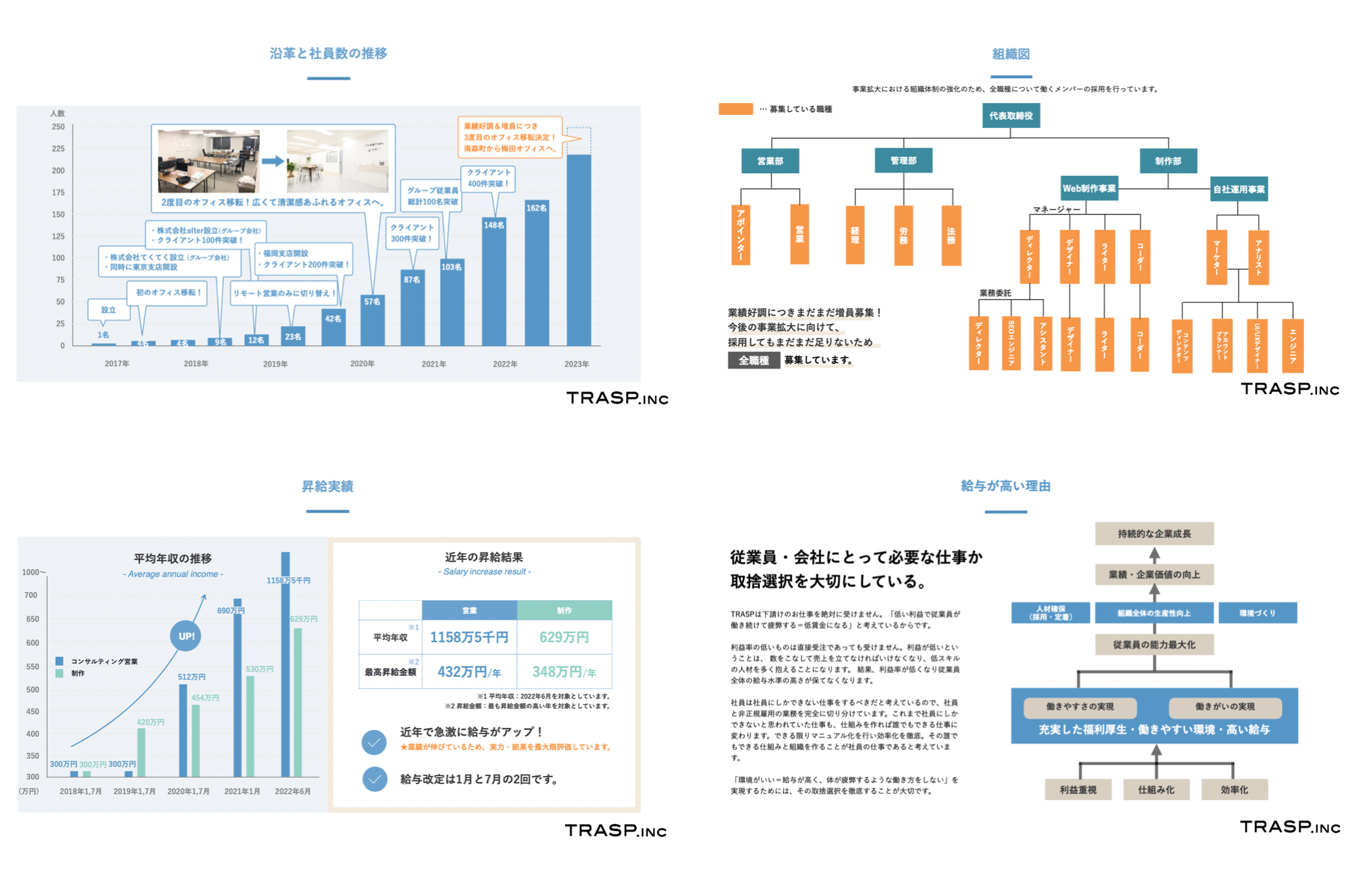 求職者の方々へTRASP株式会社を知っていただくための会社説明資料です。資料には、事業の成長経歴、事業内容、組織図、メンバー、男女比、制作の進め方、給与制度、評価制度などを掲載しています。
