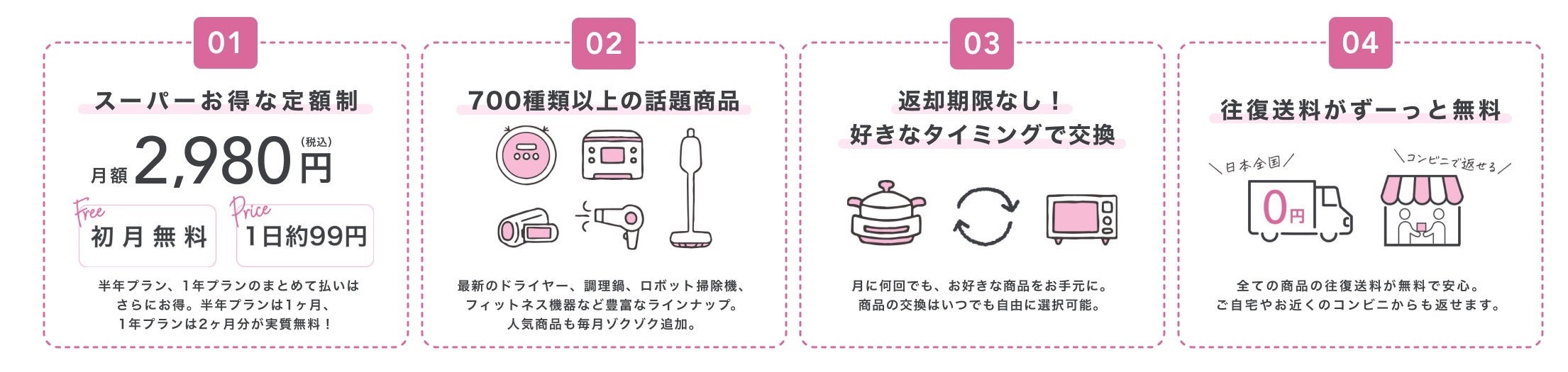 『アリスプライム』は、話題の最新家電や美容家電など700種類以上の商品が、月額2,980円(税込)で自由にご利用いただける定額制シェアリングサービスです。往復送料無料でいつでもお好きな商品に交換ができ、返却期限がないので安心して長期間ご利用いただけます。初めてご登録いただく場合、初回1ヶ月無料でご利用いただけるキャンペーンを開催しております。