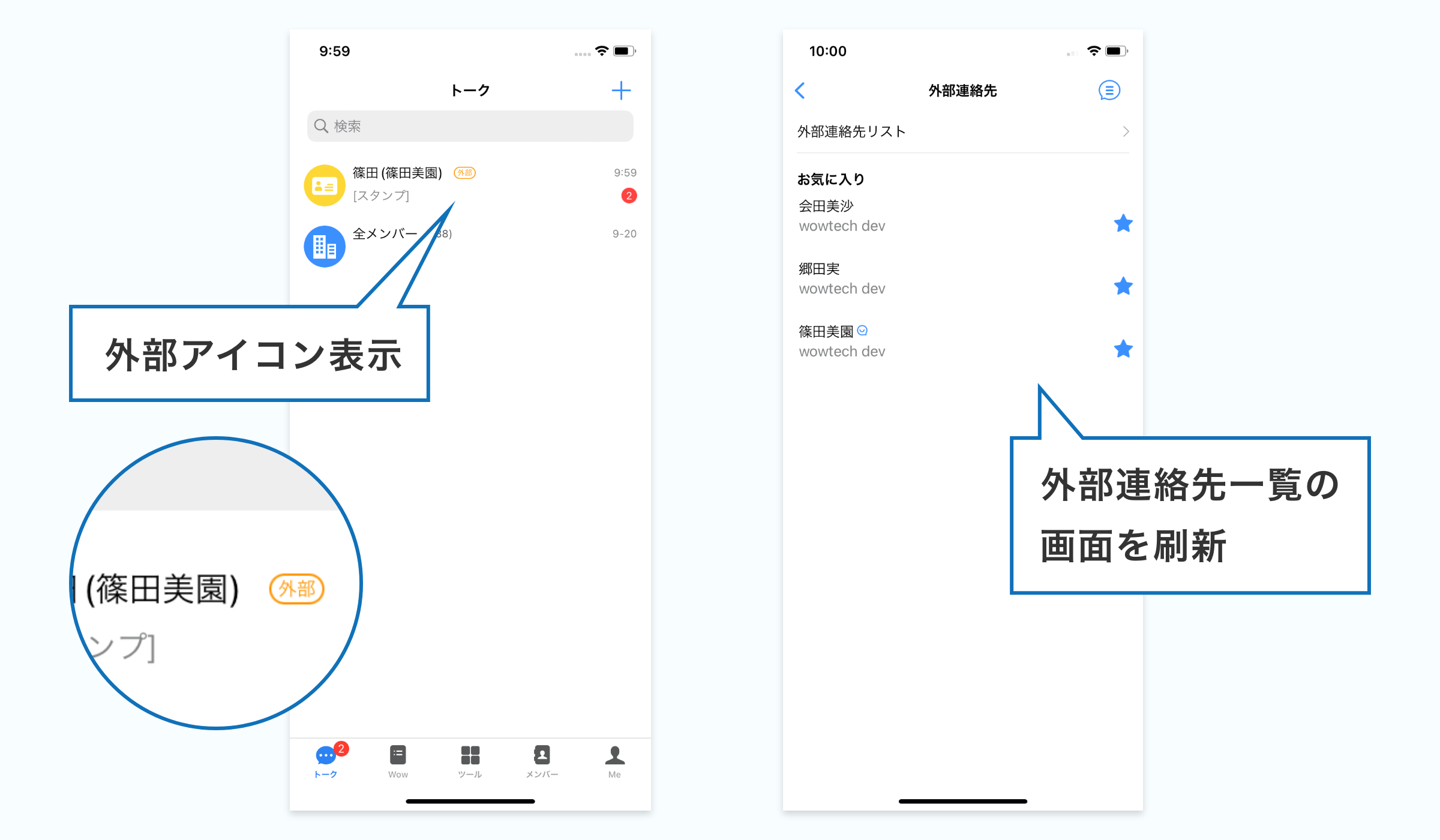 クラウド名刺管理「CAMCARD BUSINESS」との連携機能である「ゲストチャット」機能において、UIの改良を図りました。トーク一覧画面において外部ユーザーとのトークには「外部」のアイコンを表示するようにし、それ以外のトークと判別がつきやすいようにしたほか、外部連絡先一覧の画面UIをシンプルなものに刷新し、より情報を探しやすいようにしました。
