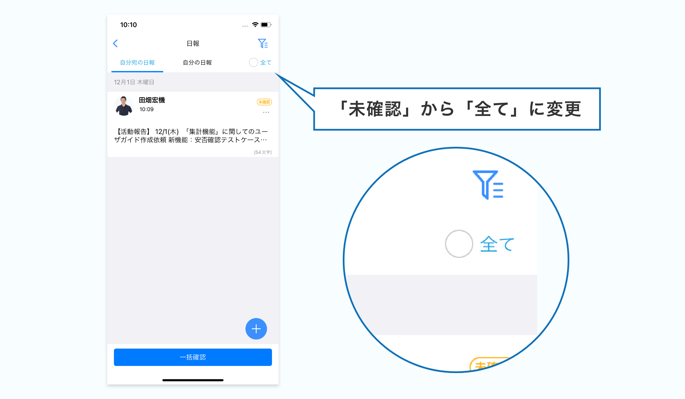 「日報」機能において、未確認の日報を表示する機能のボタンのコピーを「未確認」から「全て」に変更し、表現のわかりづらさを解消しました。