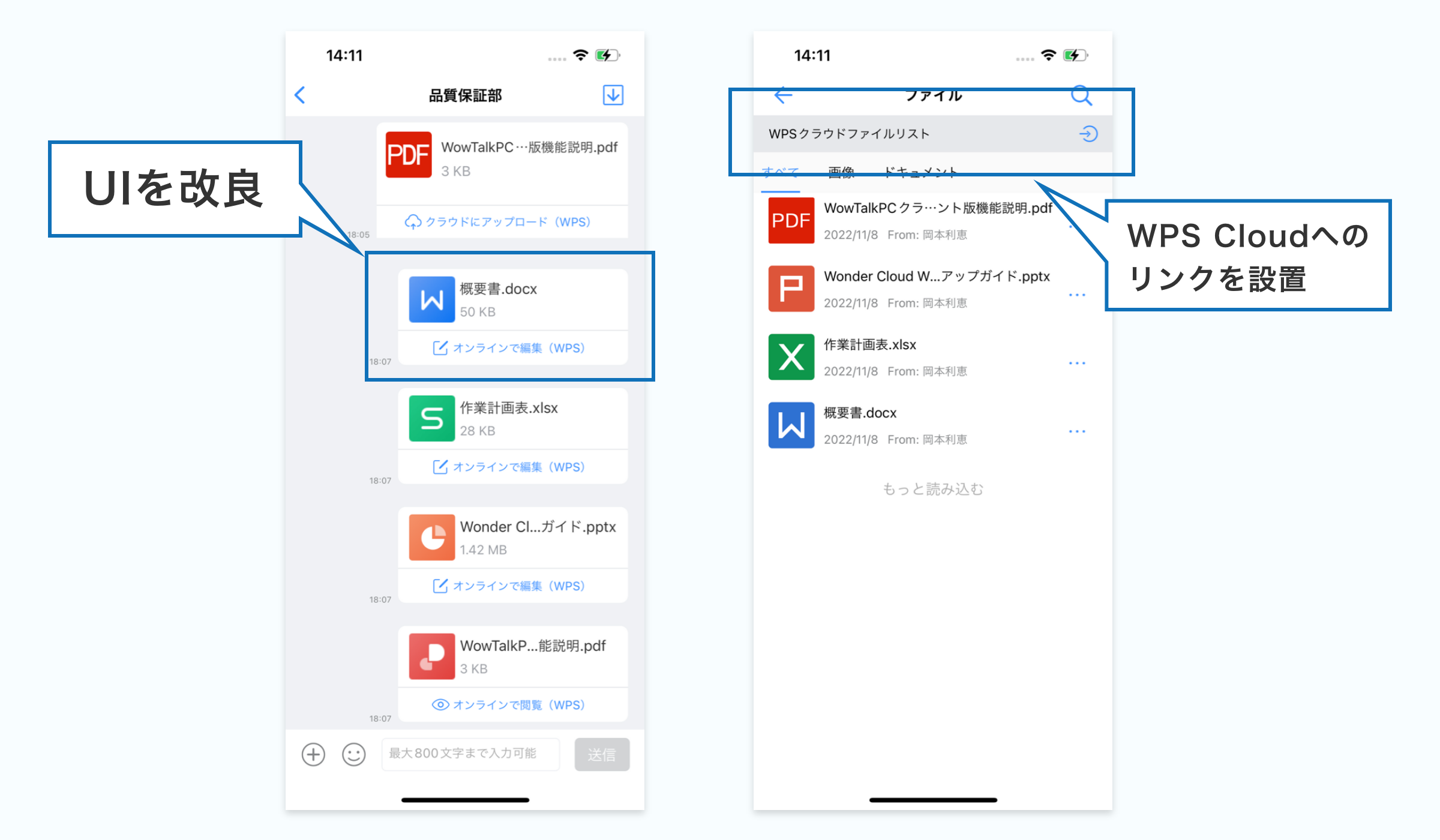 また、トークの「ファイル」管理画面の上部にWPS Cloudへのリンクを設置し、チャットからクラウドストレージへの移行をより簡便に行えるようにしました。