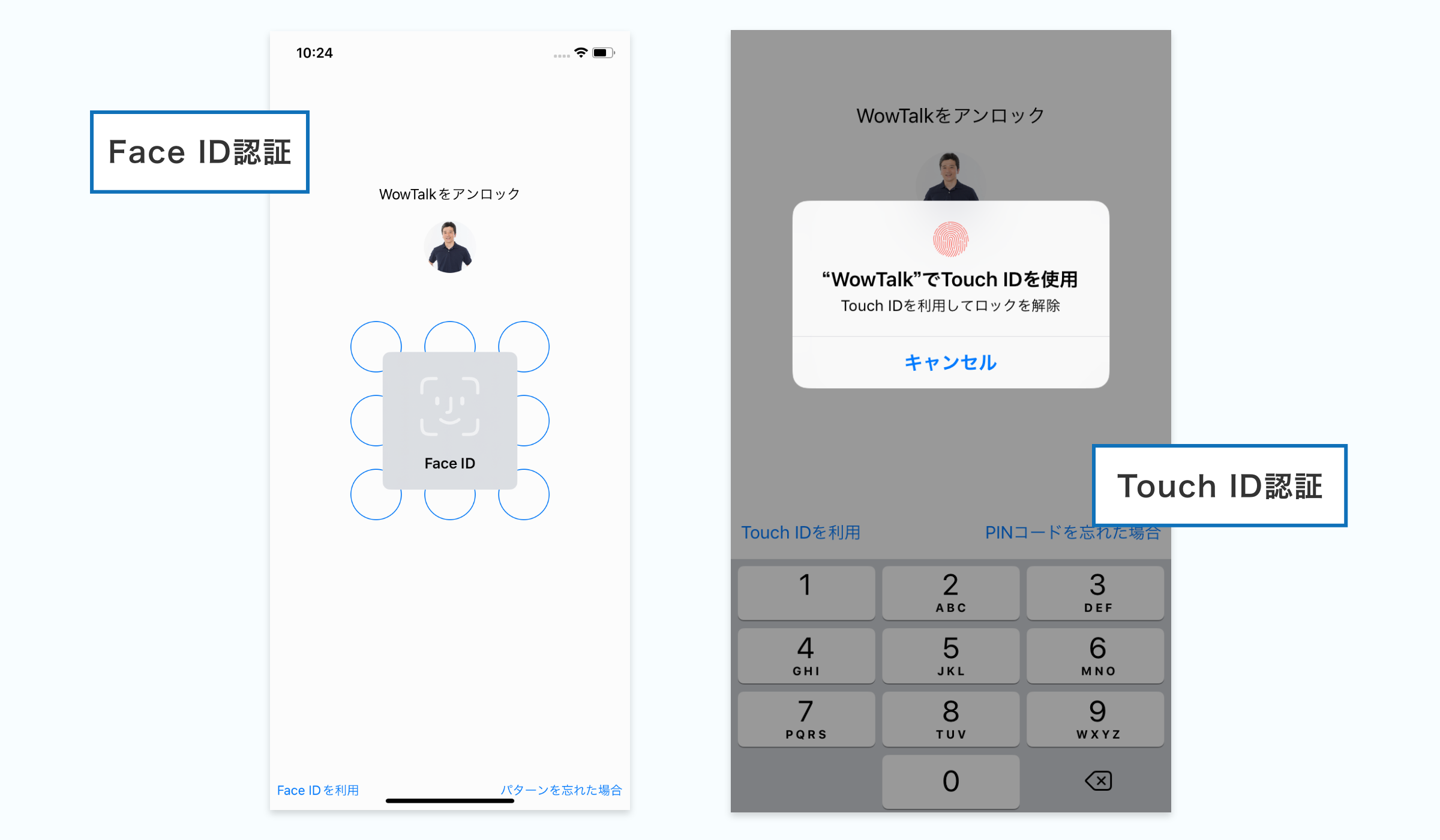 WowTalkアプリ起動時のセキュリティ設定に、生体認証の設定を追加しました。アプリ起動時、PINコードやパターンだけでなくデバイスに保存された生体認証をご利用いただけるようになりました。