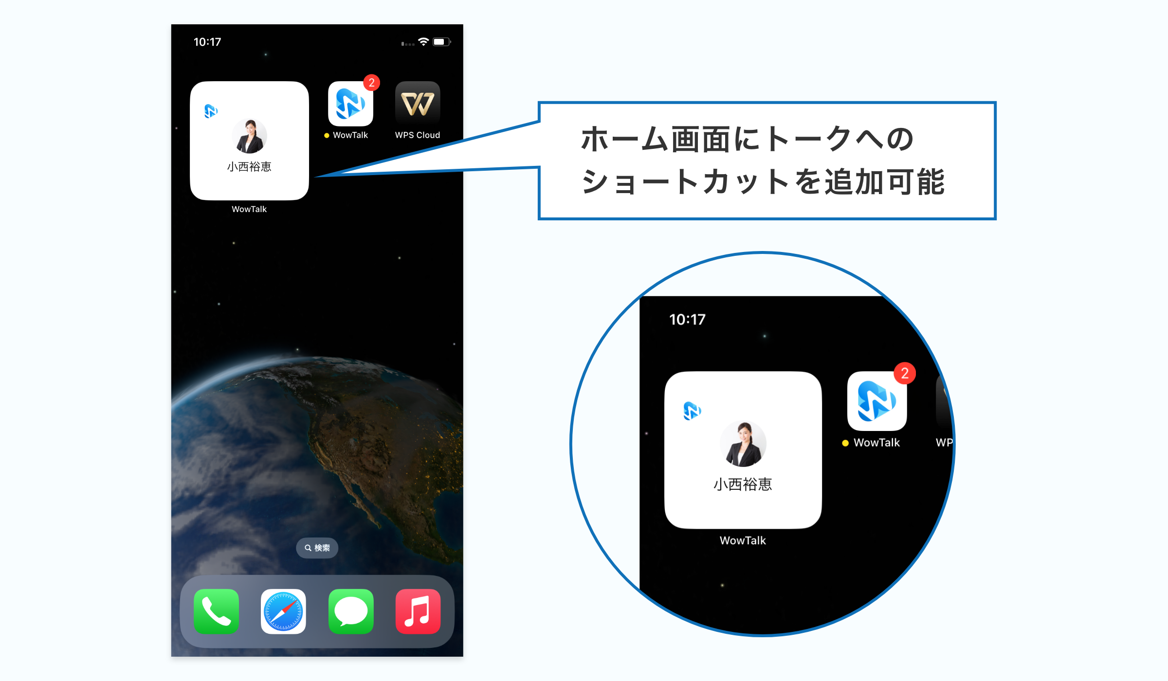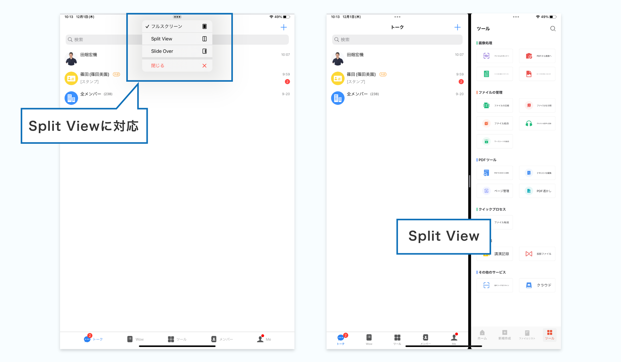 iOSにおいて、1つの画面内で複数のアプリを同時に開ける「Split View」機能に対応しました。Split View機能をお使いいただくことで、WowTalkの画面を見ながら他アプリの操作も行うことができるようになります。マルチタスクにおける利便性の向上を図りました。
