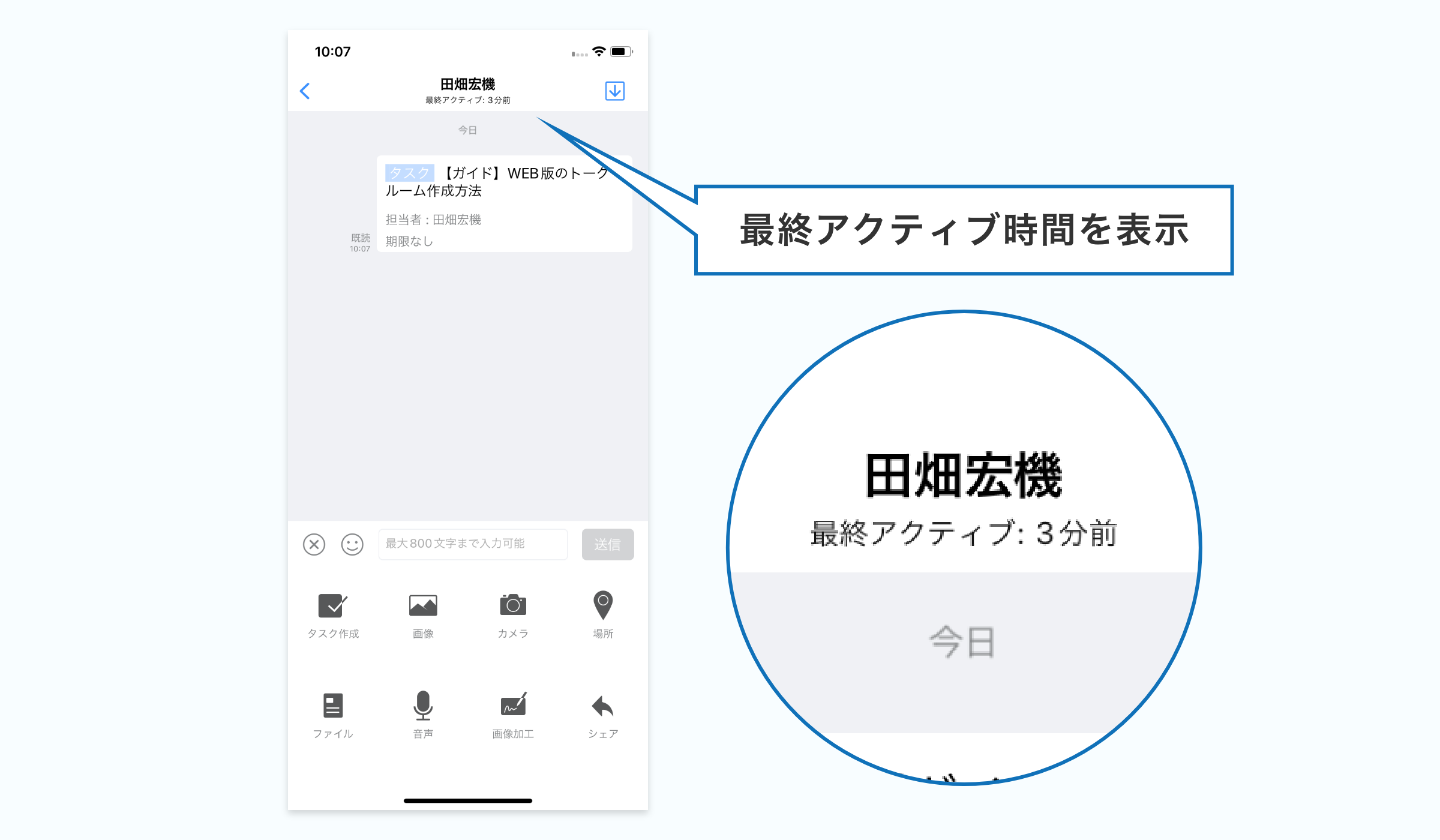 1:1のトークにおいて、相手メンバーの最終アクティブ時間を表示するようにしました。トーク名の下に相手メンバーが最後にモバイルデバイスを起動した時間が表示されるようになり、相手メンバーのステータス状況をキャッチアップしやすくなりました。