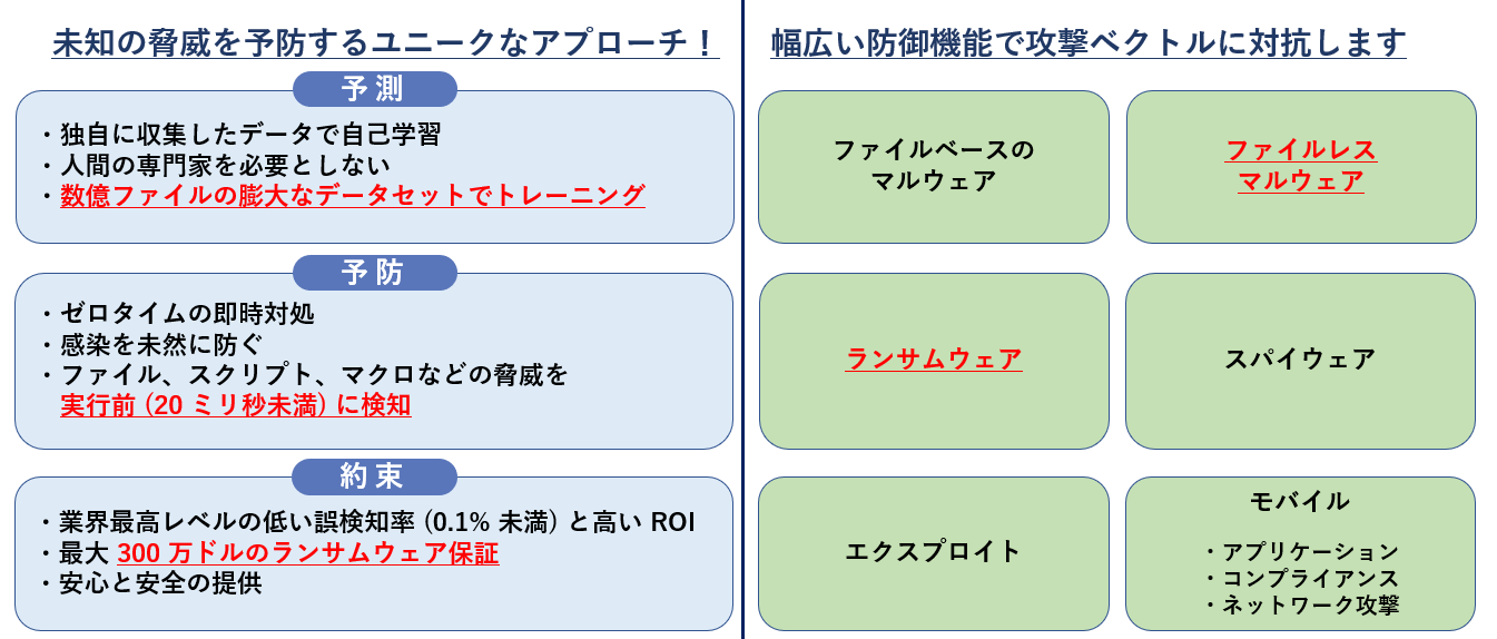 ①20ミリ秒未満で悪性ファイルを識別することで、実行前の段階で攻撃を阻止