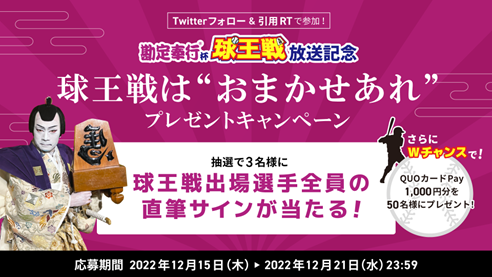 OBC公式Twitterでは、『勘定奉行杯 球王戦』の開催・放送を記念して、Twitterプレゼントキャンペーンを12月15日から開始いたします。