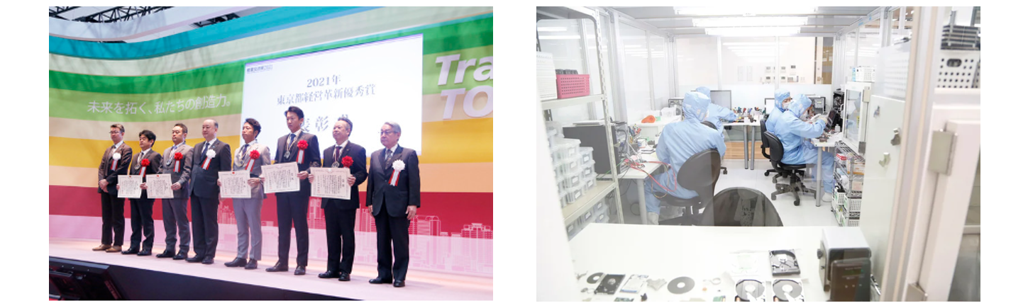 データ復旧サービス「デジタルデータリカバリー」には、HDDやSSD、サーバー、SDカード、USBメモリ、スマートフォンといった、電子機器のデータ消失トラブルのご相談が年間数万件単位で寄せられます。デジタルデータリカバリーは、お客様の大切なデータを守るため、他社様で復旧できなかったデータの復旧実績の増加や、社内復旧ラボの積極的な公開、エンジニアの専門チーム制による技術力の強化などを行ってまいりました。2021年11月25日には、表面に傷のついたHDD障害に対するデータ復旧技術を向上させ顕著な経営向上を果たしたとして、東京都経営革新優秀賞を受賞しました。