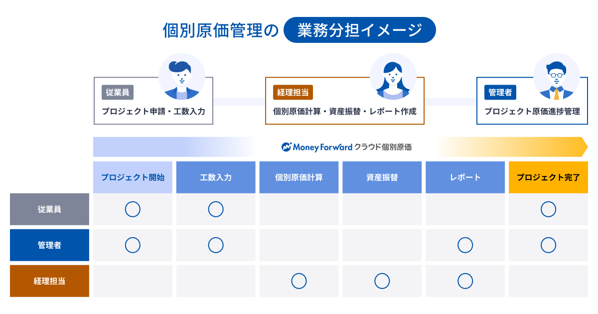 こうした工数管理業務と個別原価計算業務の分断から生じる手間や負担を解消するため、『マネーフォワード クラウド個別原価』の提供を開始します。当社は、『マネーフォワード クラウド個別原価』を通じて、現場担当者が行う工数管理と経理担当者の個別原価計算のそれぞれの業務をトータルサポートすることで、個別原価管理の効率化を実現します。