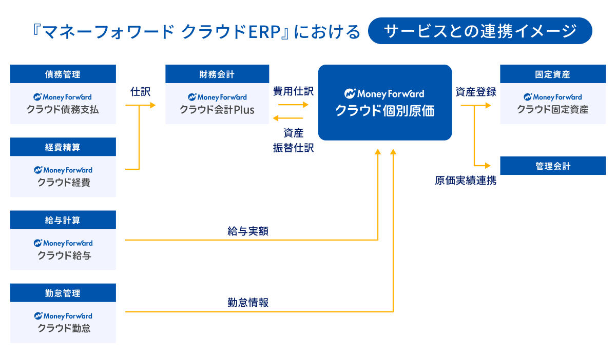 今後は、『マネーフォワード クラウドERP』の会計財務・人事労務領域のサービスと『マネーフォワード クラウド個別原価』を連携することで、会計の仕訳データや給与実績、勤怠情報などの取得が容易になり、より正確かつ効率的に個別原価計算を行うことができるようになります。また、『マネーフォワード クラウド個別原価』のデータをもとに、資産振替仕訳や資産登録まで効率化できます。