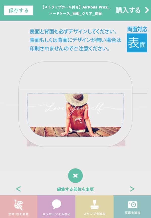 下記URLをクリックすると、新型AirPods Pro(第2世代)に対応したAirPods Pro2ケース(片面クリアハードケース)作りが体験できます。デザイン作成は無料です。もしお気に入りのデザインができればもちろん購入可能!