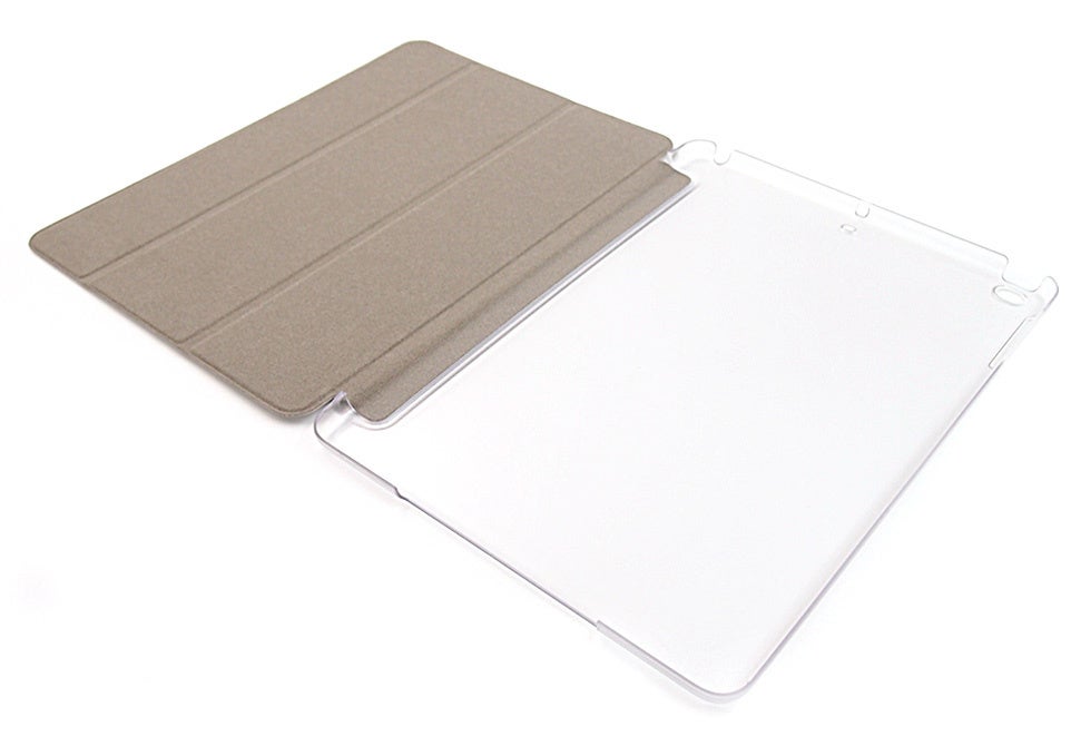 印刷面となる表面は全面手に優しく馴染む合皮製のPUレザーカバーを使用(内側はグレー)。本体を設置する箇所は半透明(マット加工)ポリカーボネート製で設計の滑りにくく持ちやすいiPadカバーです。iPadを心地よくご利用頂ける使い勝手の良いiPadケースです。