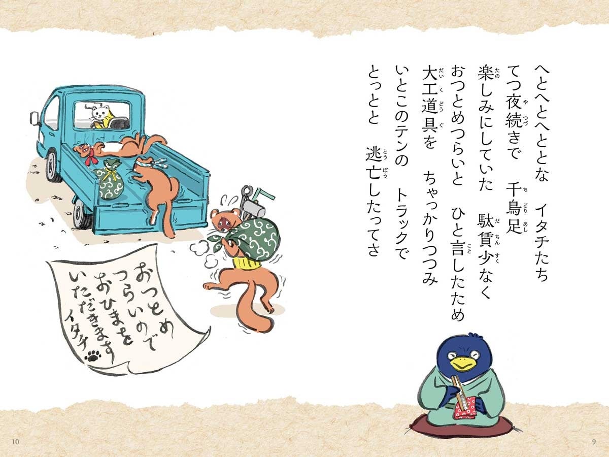 また今作は、ニュース形式で展開した前2作からうってかわり、こばなし形式になった点も特徴で、「はなしか」「駄賃」「おつとめ」「地団太」など、日常の会話ではあまり出てこない言葉もちりばめられています。どういう意味か親子で調べてみることでコミュニケーションが広がり、知識を習得するきっかけにもなります。