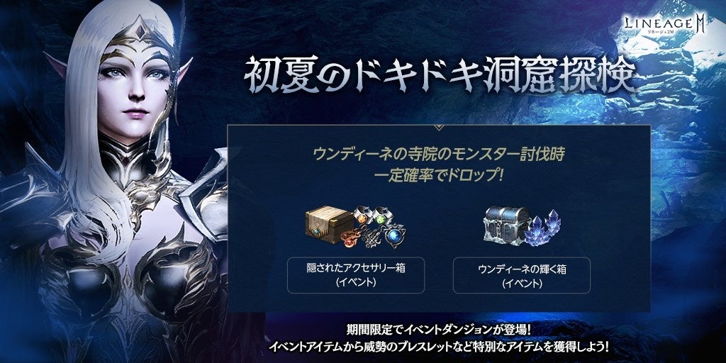 ダンジョン内のモンスターを討伐すると「クリスタル(刻印)」と「高級クリスタル(刻印)」を入手できる「ウンディーネの輝く箱(イベント)」や、「ヴァラカス イアリング箱(刻印)」「アンタラス イアリング箱(刻印)」「威勢のブレスレット箱(刻印)」「加護のブレスレット箱(刻印)」「エヴァの印章箱(刻印)」の内、1つをランダムで入手することができる「隠されたアクセサリー箱(イベント)」を一定確率で獲得できます。