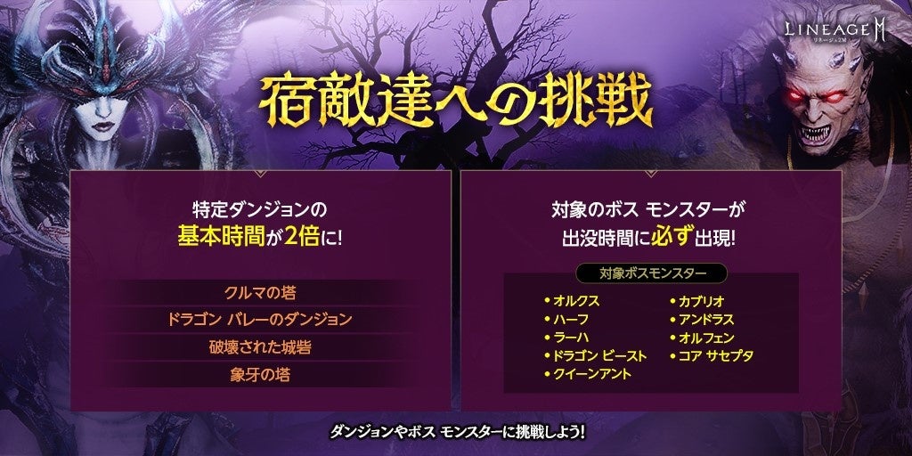 期間中、アデン大陸のボス モンスターの中で、登場間隔が100%未満の一部ボス モンスターが出没時間に100%で出現するほか、ノーマル ダンジョン「破壊された城砦」「クルマの塔」「ドラゴン バレーのダンジョン」「象牙の塔」の基本時間がそれぞれ2倍になります。